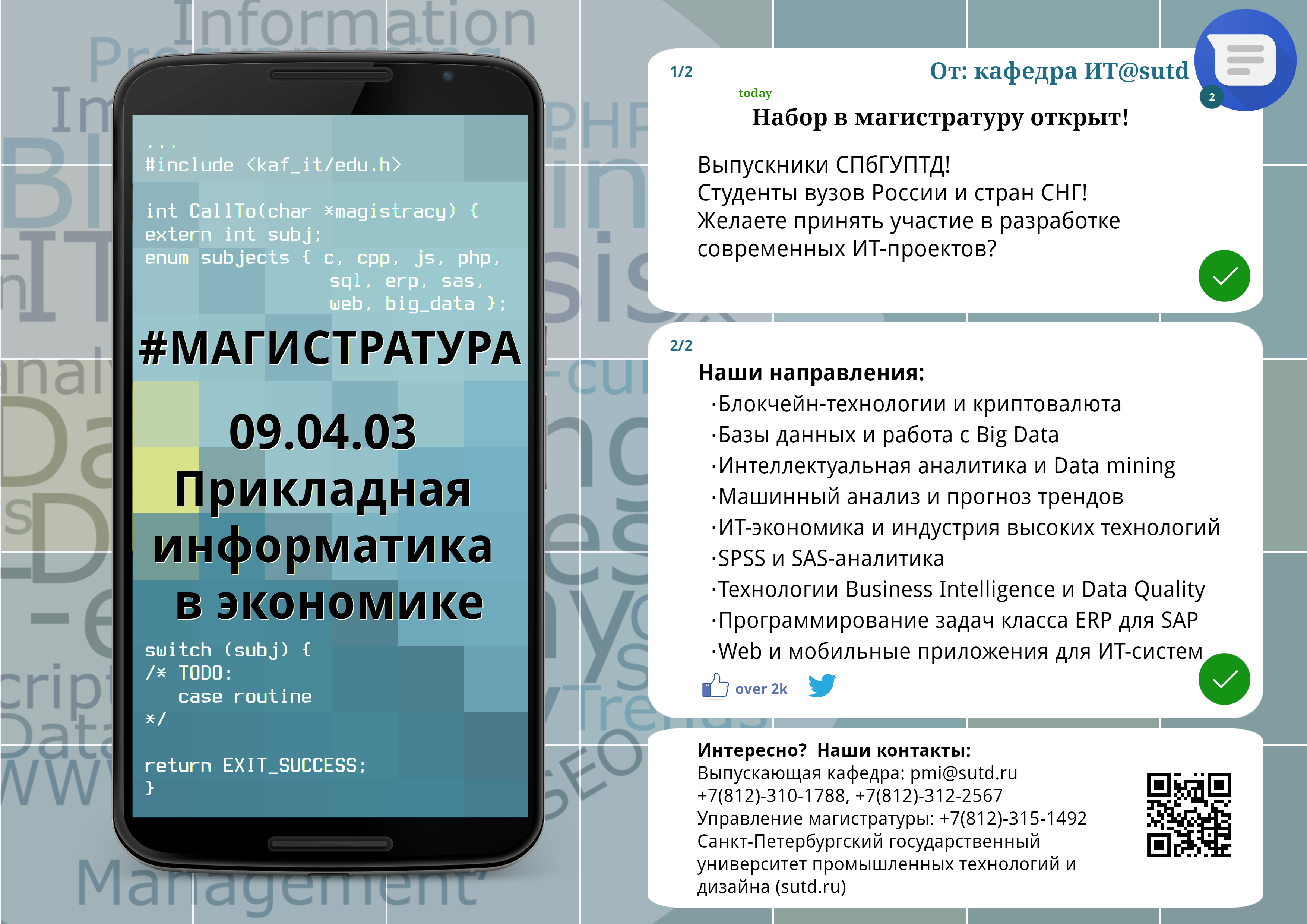 Кафедра информационных технологий более 20 лет осуществляет профессиональную подготовку специалистов по направлению 09.03.03 Прикладная информатика в экономике.